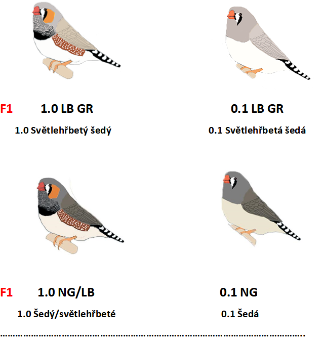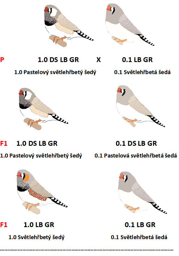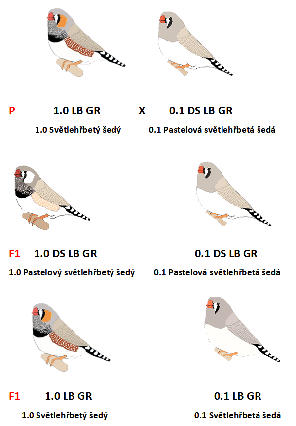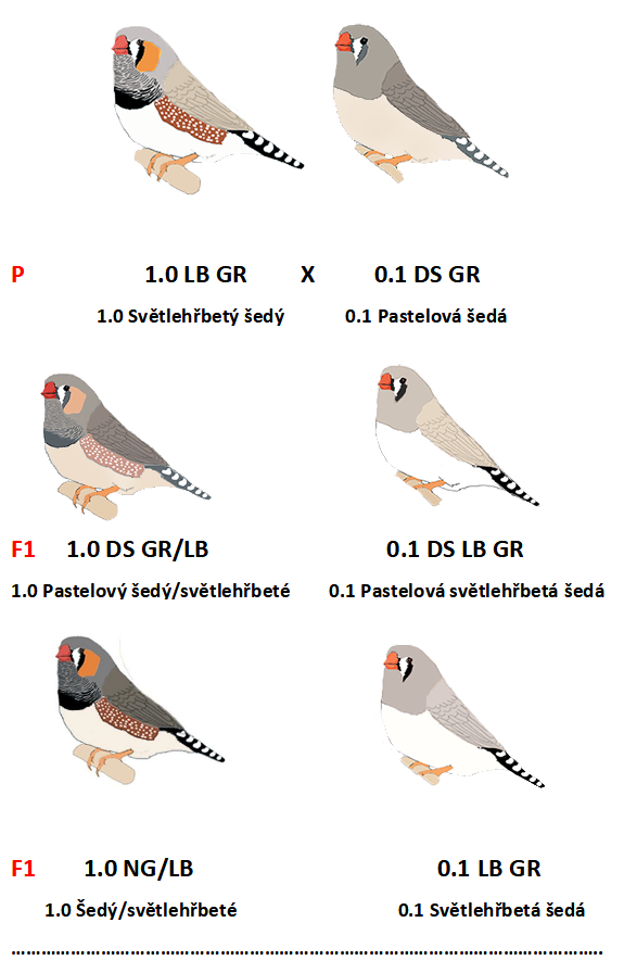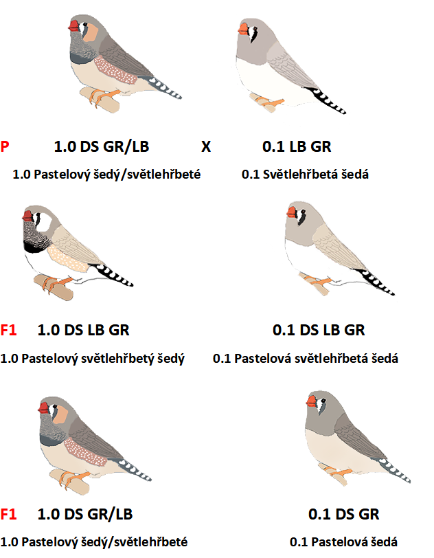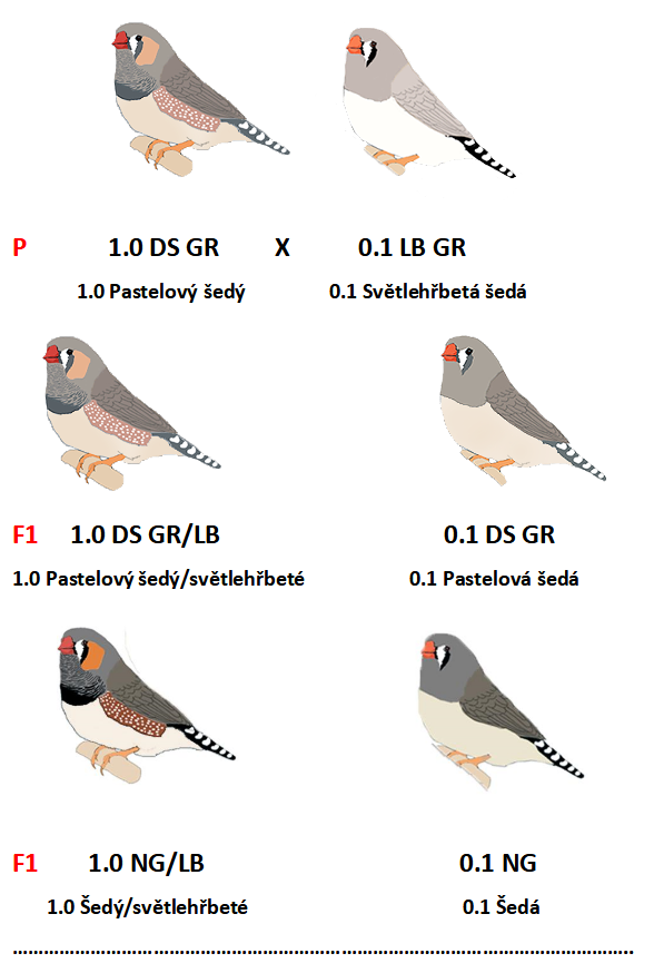 Dědičnost: neúplně dominantní - pastelová mutace a vázaná na pohlaví - světlehřbetá mutace